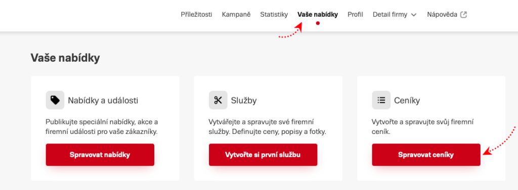 Ceník se zobrazuje přímo na detailu firemního profilu a pomáhá zákazníkům rychle zjistit orientační ceny vašich služeb.
