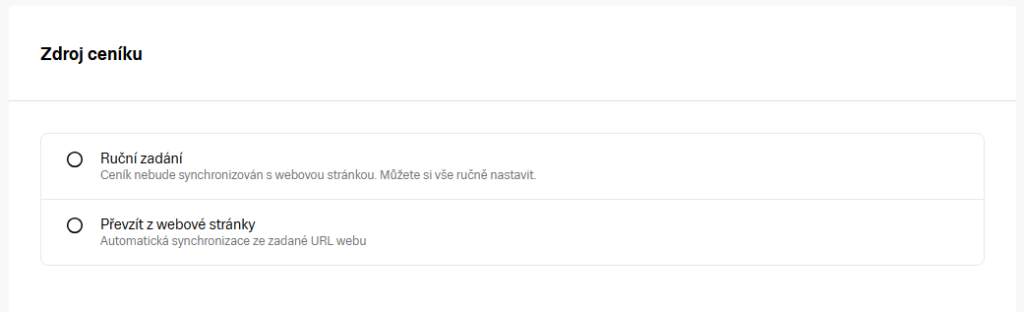 Při vytváření nebo úpravě ceníku si můžete vybrat jeden ze dvou zdrojů: