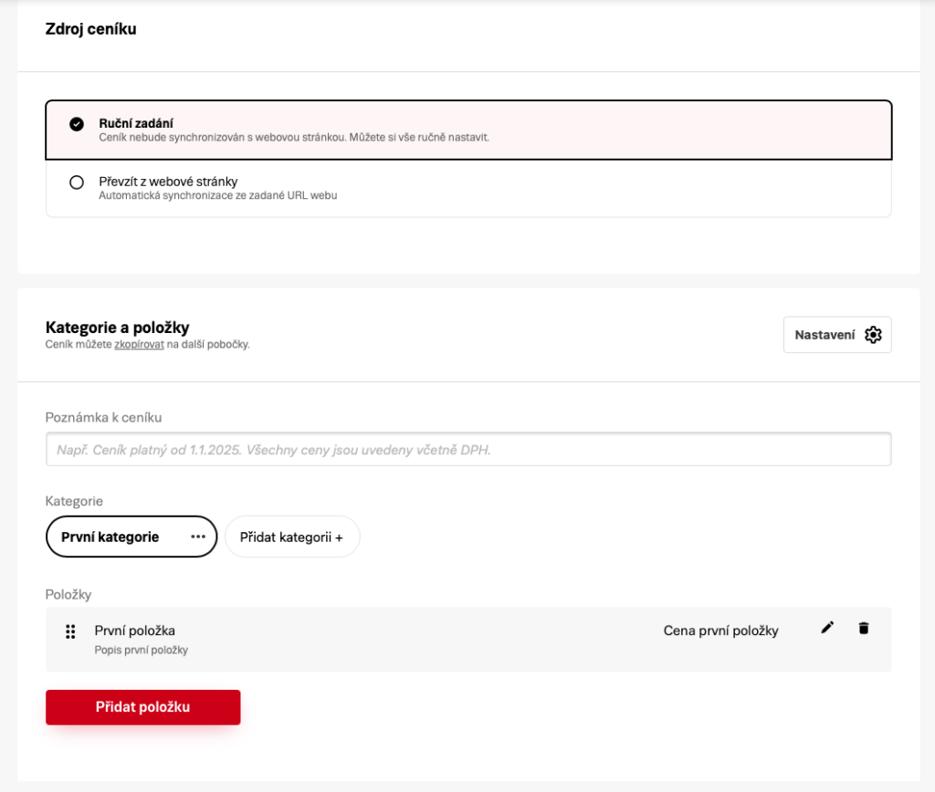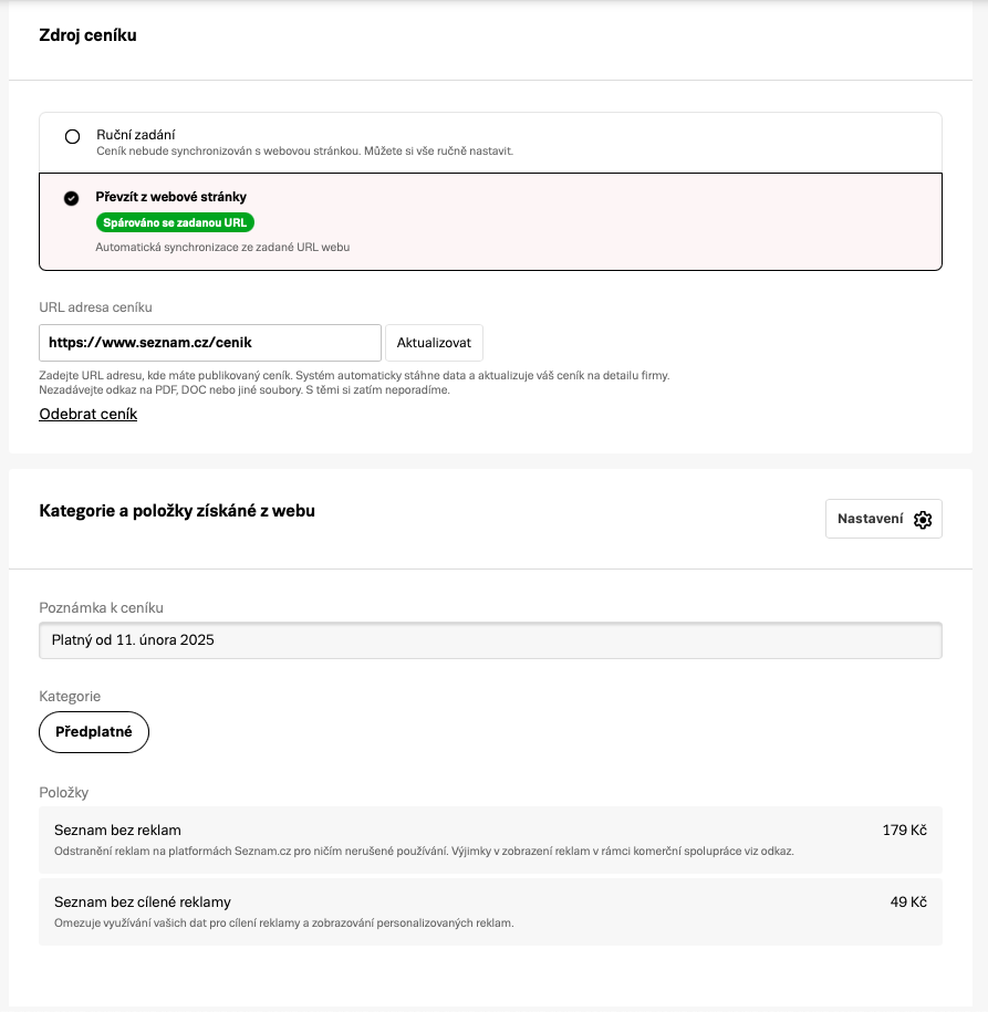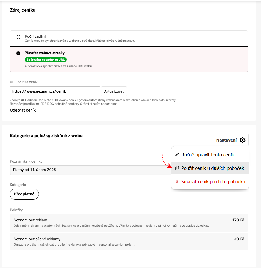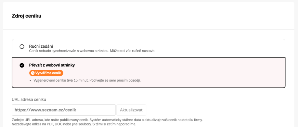V takovém případě doporučujeme použít převzetí z webové stránky, aby byl ceník na Firmy.cz vždy aktuální.