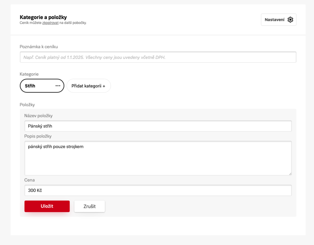 - Každá kategorie obsahuje konkrétní položky s cenami a případným popisem,