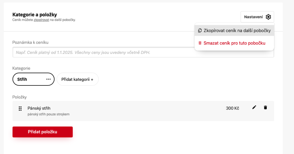 Ceník spravujete v administraci firemního profilu. Každý ceník je vždy přiřazen ke konkrétní pobočce.