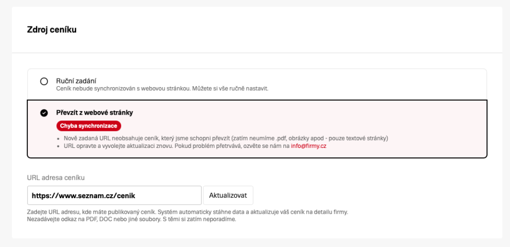 - pokud je na stránce ceník, který dokážeme zpracovat (viz. výše) a nedaří se vám ho opakovaně, načíst, kontaktujte nás na info@firmy.cz a případ prověříme.
