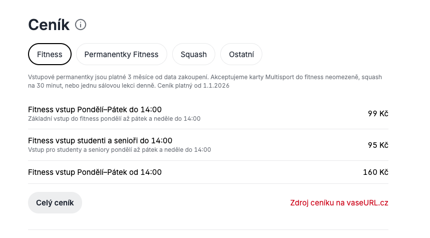 Ceník je rozdělený do kategorií (např. Fitness, Squash, Vývoj webových stránek).