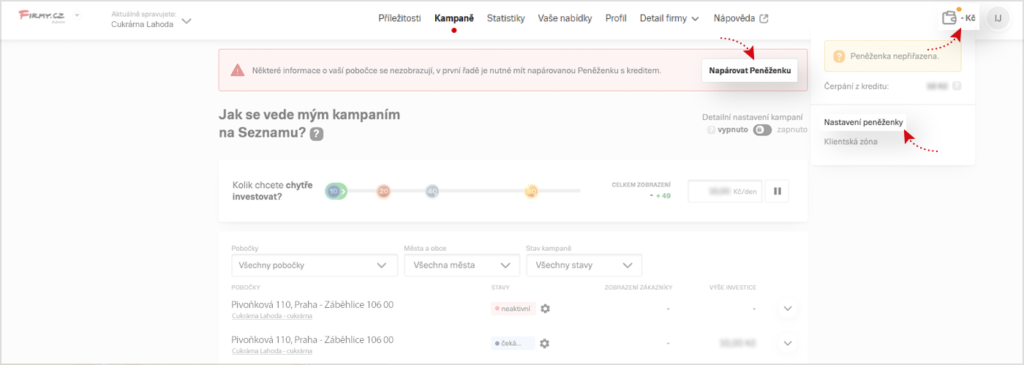 Peněženka je virtuální účet, kam si posíláte finanční prostředky. Z těchto financí se čerpá denní investice pro běh vaší kampaně na následující den.