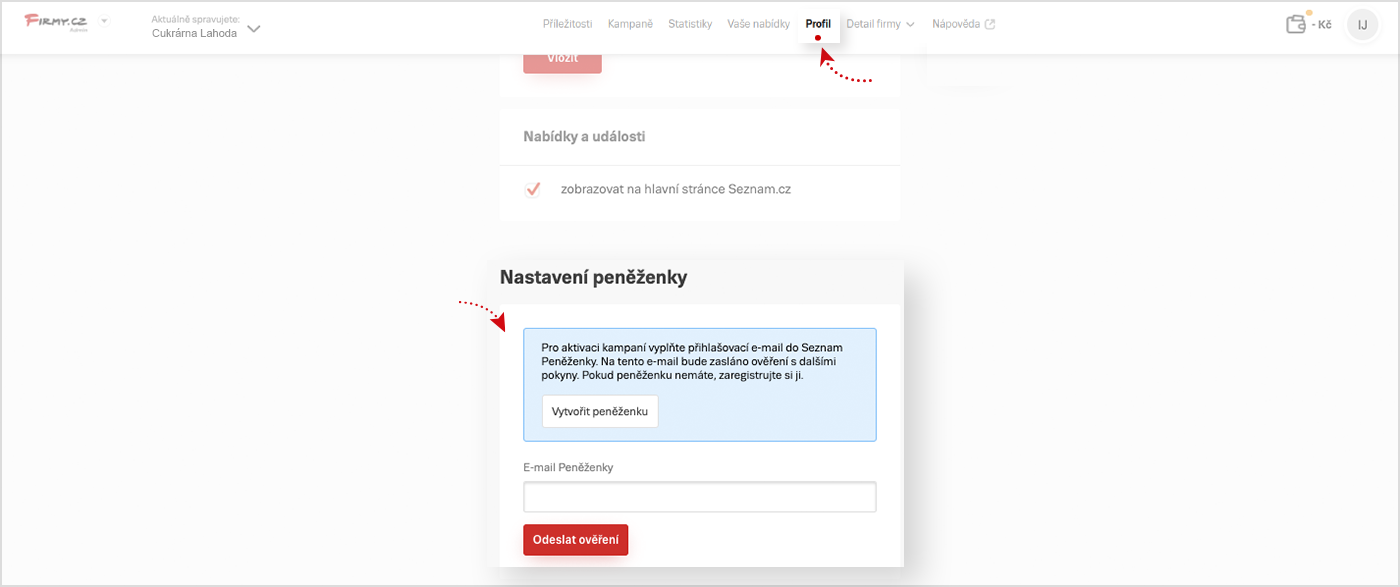 - Profil → Nastavení profilu → Nastavení peněženky.