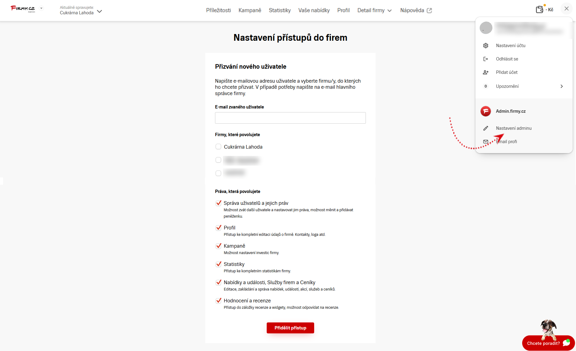Na domovské stránce adminu klikněte vpravo nahoře na své iniciály a pak na Nastavení účtu. Do textového pole napište e-mailovou adresu, na kterou zašleme pozvánku (vstup platí pro celou strukturu jednoho IČ) a zvolte konkrétní práva z nabídky. Standardně jsou vybrána všechna práva z nabídky. Kliknutím na fajfku konkrétní právo odeberete.