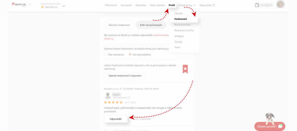 Na domovské stránce adminu klikněte na záložku Profil → Hodnocení. Dostanete se na stránku s výpisem recenzí, které uživatelé na váš firemní profil vložili. Na každou recenzi můžete reagovat pomocí tlačítka Odpovědět. Svou odpověď můžete editovat. Pokud konkrétní uživatel přepíše svou recenzi, na kterou jste reagovali, smaže se i vaše odpověď.