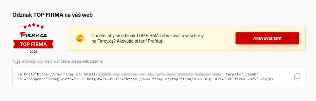 pomocí připraveného kódu si odznak TOP firma můžete vložit na vlastní webové stránky.