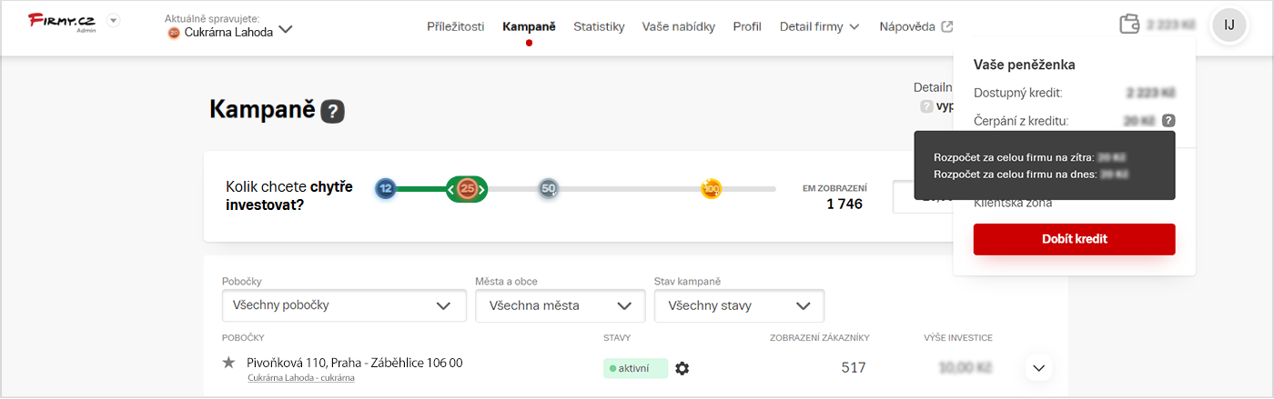 Konkrétní počet závisí na výši vaší investice. V jednotlivých záložkách (admin.firmy.cz → Kampaně) si můžete prohlédnout, jak se vaše firma na dané službě vizuálně prezentuje. Dále u jednotlivých služeb vidíte odhad zobrazení, která vaše firma z dané služby může při aktuálním nastavení výše investice získat v následujících 7 dnech.