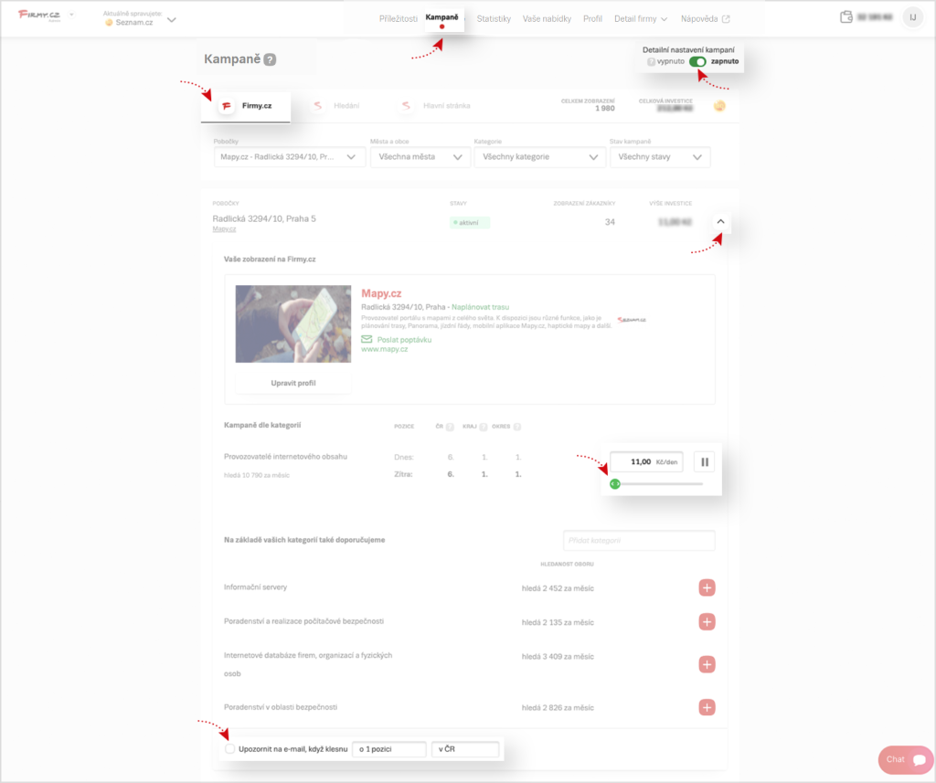 Dostanete se do záložky Firmy.cz a po rozkliknutí pobočky (rozbalovací šipka – viz obrázek níže) vidíte výpis kategorií. Na první pohled je patrné, která kategorie je aktivní (vidíte investici). U neaktivní kategorie se zobrazuje možnost spustit kampaň (červené tlačítko).